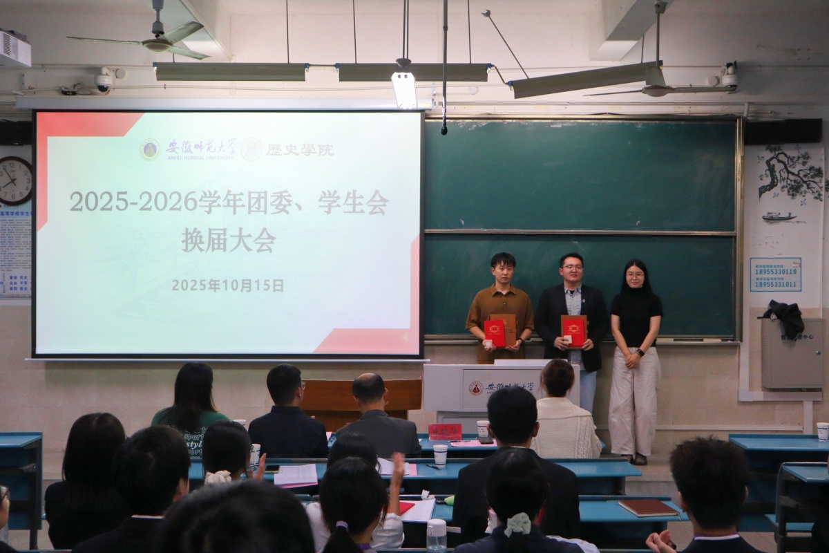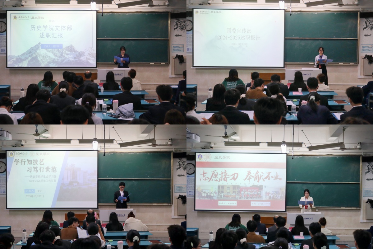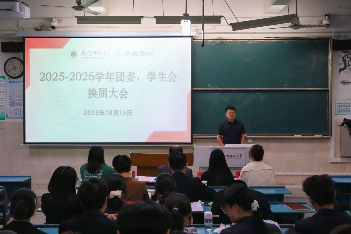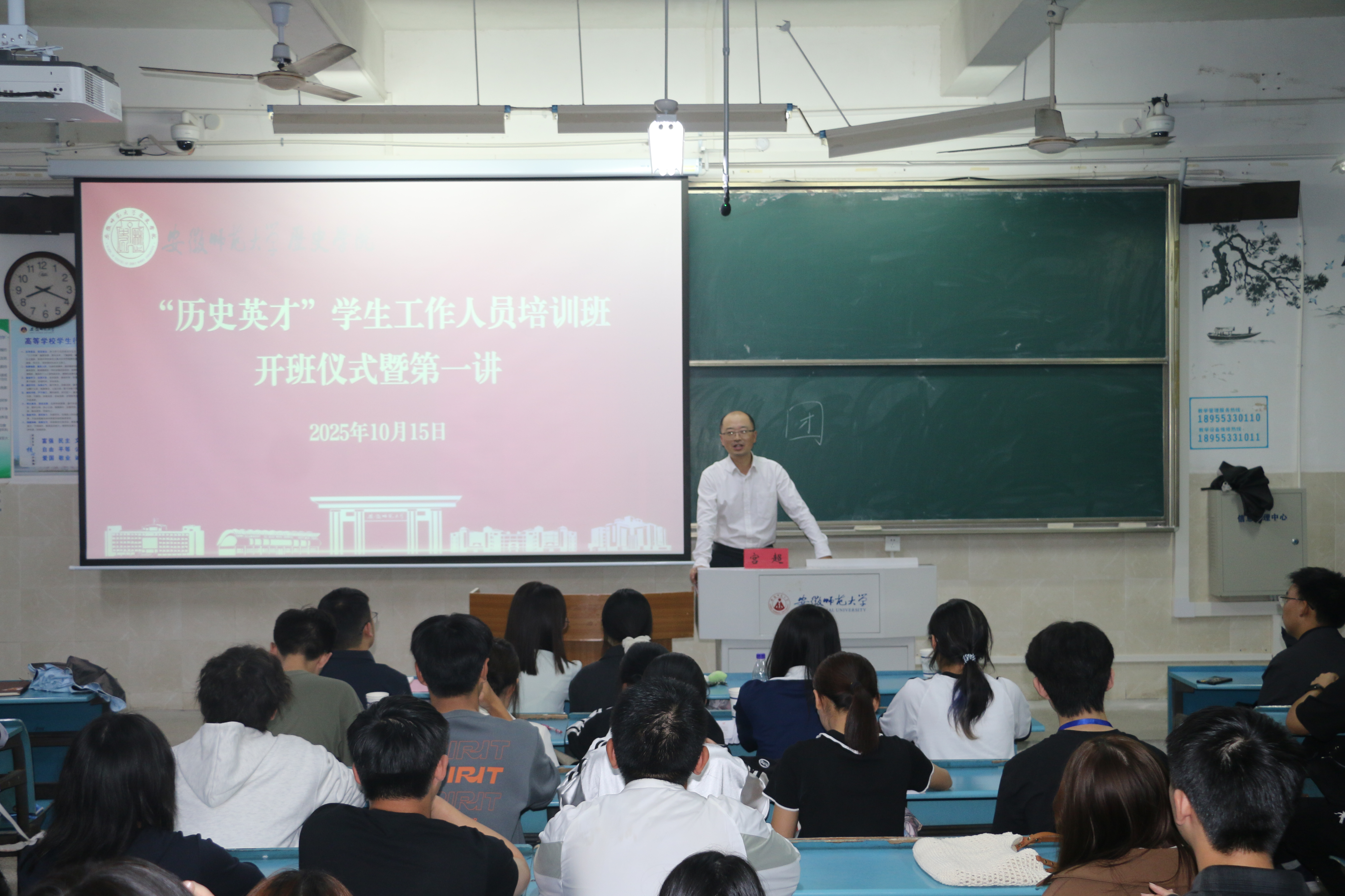 本网讯(图/郭玉莹 文/李陈静)10月15日晚,历史学院在行知楼2010201教室举办了2025-2026学年团委、学生会换届大会暨“历史英才”学生工作人员培训班开班第一讲。院党委副书记宫超,团委书记郭忠尧,辅导员朱晓华、韩雪、周佳妮出席会议,第67、68届团委、学生会全体工作人员及各学生社团、班级负责人参会。