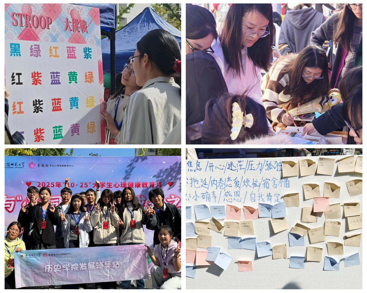 本次“‘10·25’大学生心理健康教育月”系列活动,通过多元化互动形式搭建心灵沟通桥梁,精准普及科学心理健康知识,引导同学们深度探索自我、学会与自我和解。历史学院将持续完善心理健康教育工作体系,以更精准、更贴心的服务守护大学生心灵成长,为同学们全面发展保驾护航。