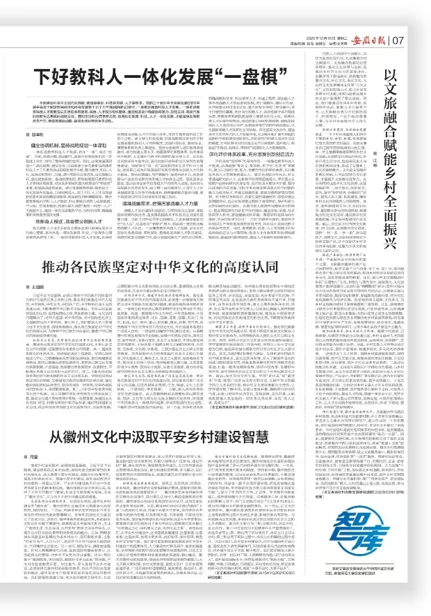 12月16日,《安徽日报》第7版(“思想周刊・理论”智库专版)集中刊发我校中国区域文化研究院、历史学院青年教师4篇研究阐释党的二十届四中全会精神的理论文章。研究人员围绕全会提出的一体推进教育科技人才发展、繁荣发展社会主义文化、完善社会治理体系、扎实推进乡村全面振兴等重点议题,紧扣国家战略和安徽发展实际,提出具有较强现实针对性和政策参考价值的意见建议,为服务党和政府科学决策及地方经济社会高质量发展提供有力智力支持。