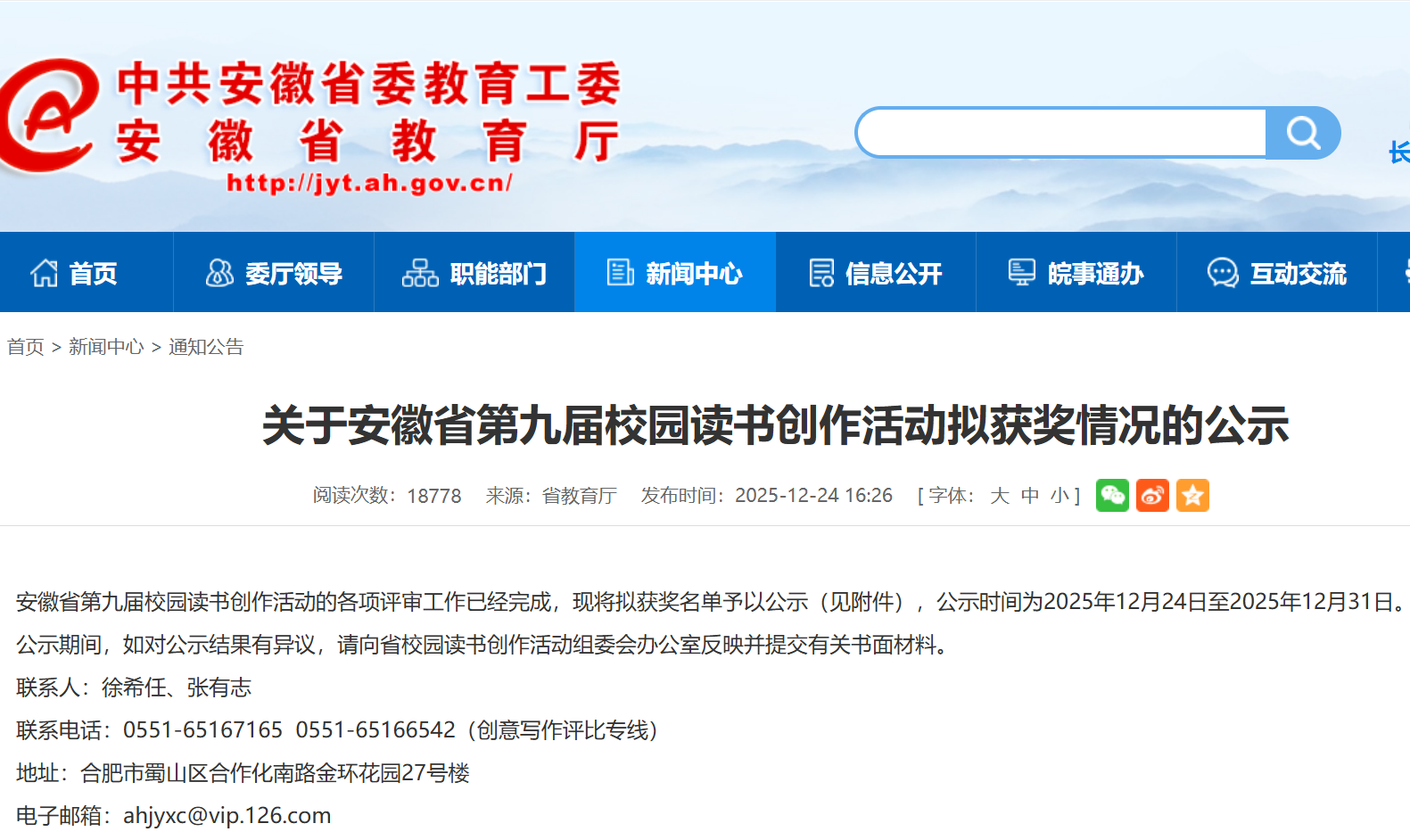本网讯(历史学院 王海靓)近日,安徽省第九届校园读书创作活动评选结果揭晓,历史学院“简明历史小课堂”凭借鲜明的育人特色、丰富的实践成果与广泛的社会影响,获评“校园阅读推广活动”。