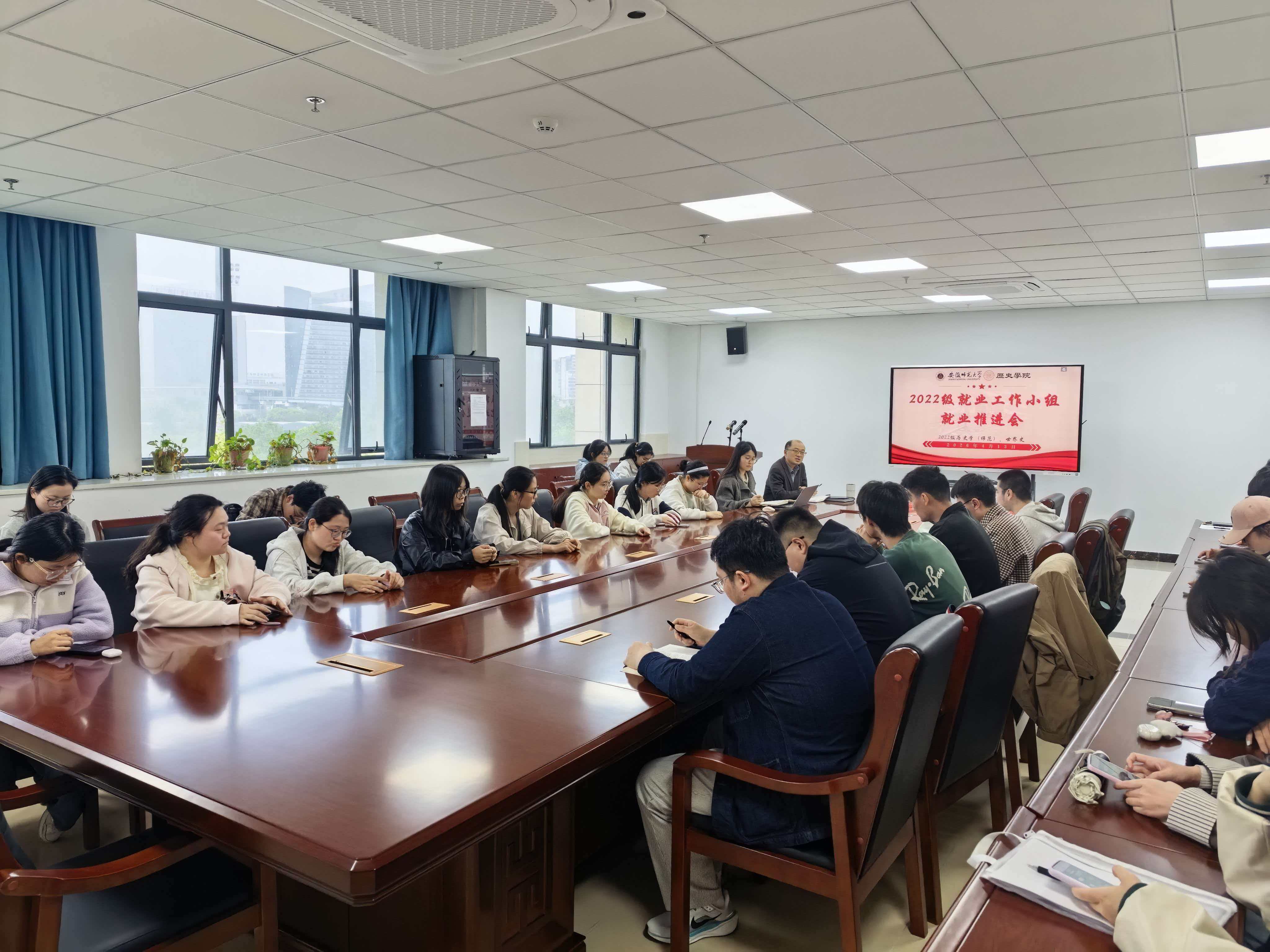 4 月 13 日下午,历史学院在B 416 会议室召开 2026 届本科毕业生就业帮扶推进会。学院党委副书记宫超、辅导员朱晓华及就业帮扶小组全体成员参会。