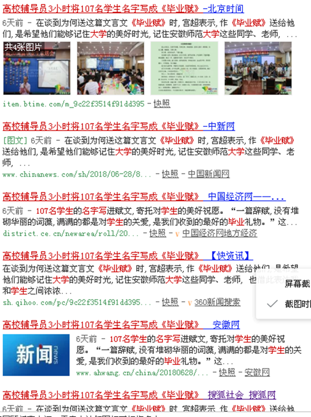 2. 中国新闻网《高校辅导员3小时将107名学生名字写成毕业赋》http://www.chinanews.com/sh/2018/06-28/8549729.shtml