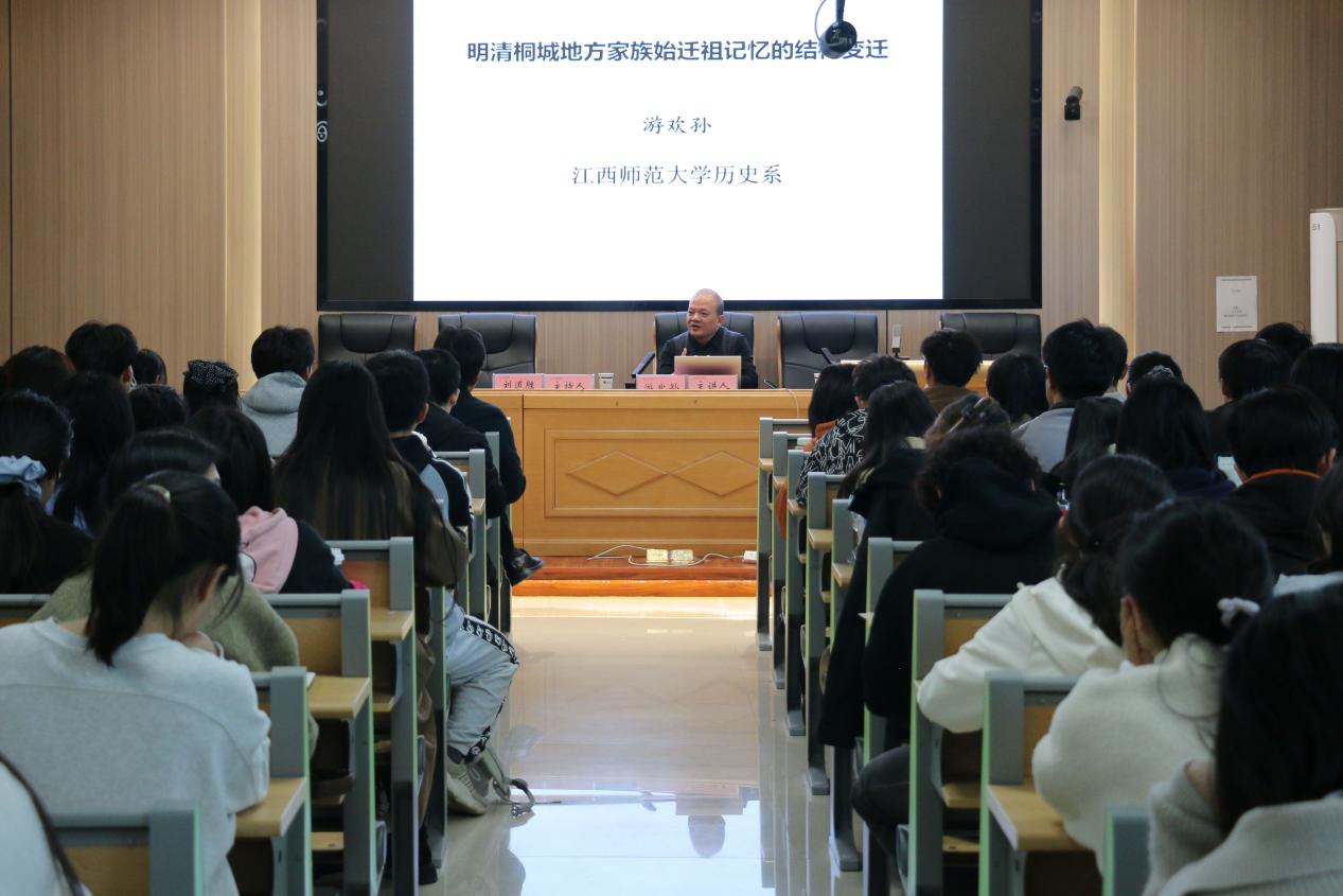 本网讯(历史学院 文/陈蒙 图/陈睿)2025年11月12日下午,江西师范大学历史系教授、博士研究生导师游欢孙应历史学院邀请,于花津校区文典楼B108报告厅做了题为“明清桐城地方家族始迁祖记忆的结构变迁”的学术报告。本次讲座由历史学院院长刘道胜教授主持,学院百余名师生到场聆听。