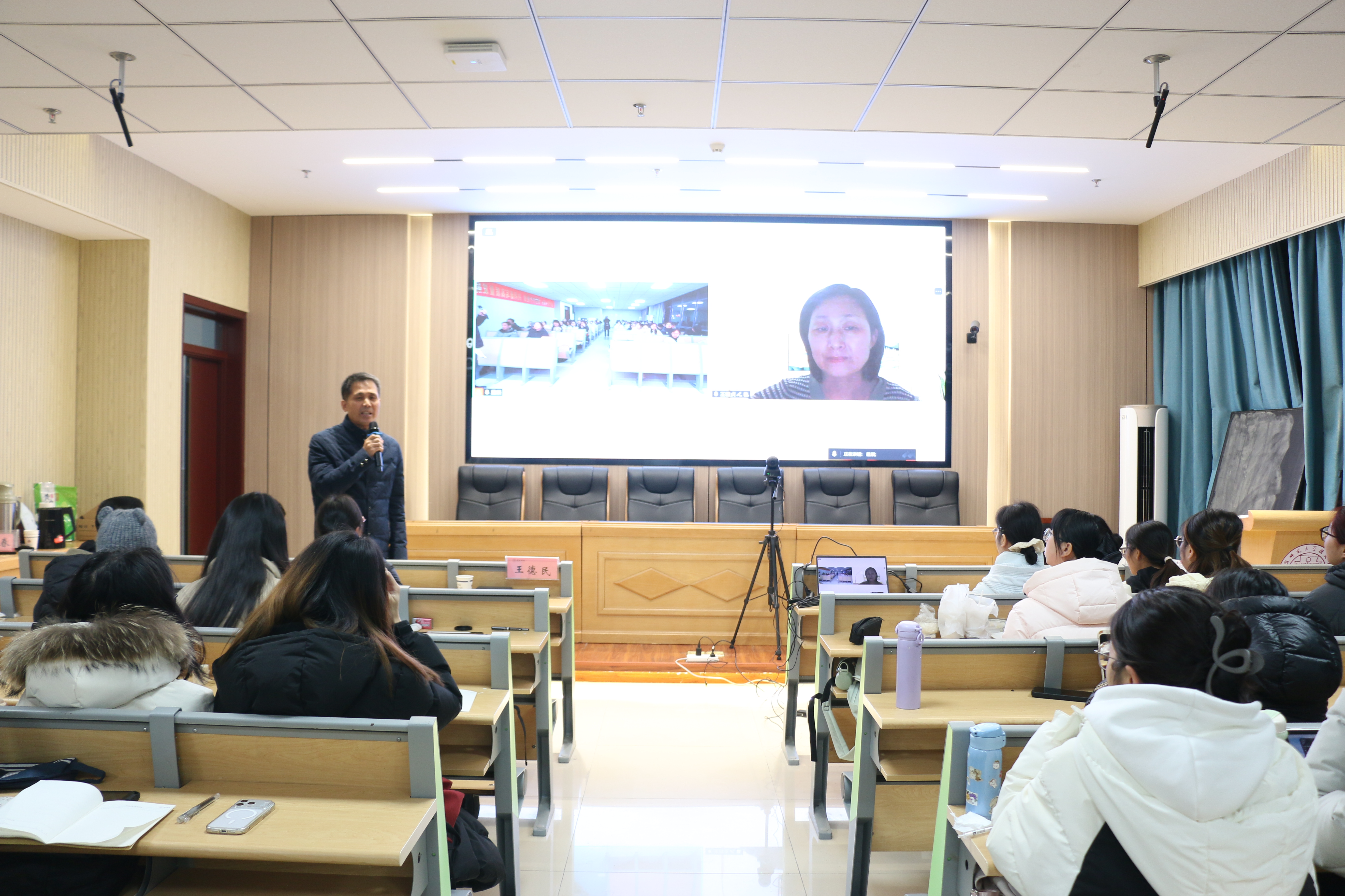 本网讯(历史学院 文/陈湘 图/陈蒙)2025年12月26日晚上,《历史教学》编辑部主任、中国教育学会历史教学专业委员会常务理事、学术委员会副主任王雅贞应历史学院邀请,在花津校区文典楼B108报告厅(线上)做了题为“中学历史教、学、研”的学术报告,本次讲座由历史学院王德民教授主持,学院百余名师生到场聆听。
