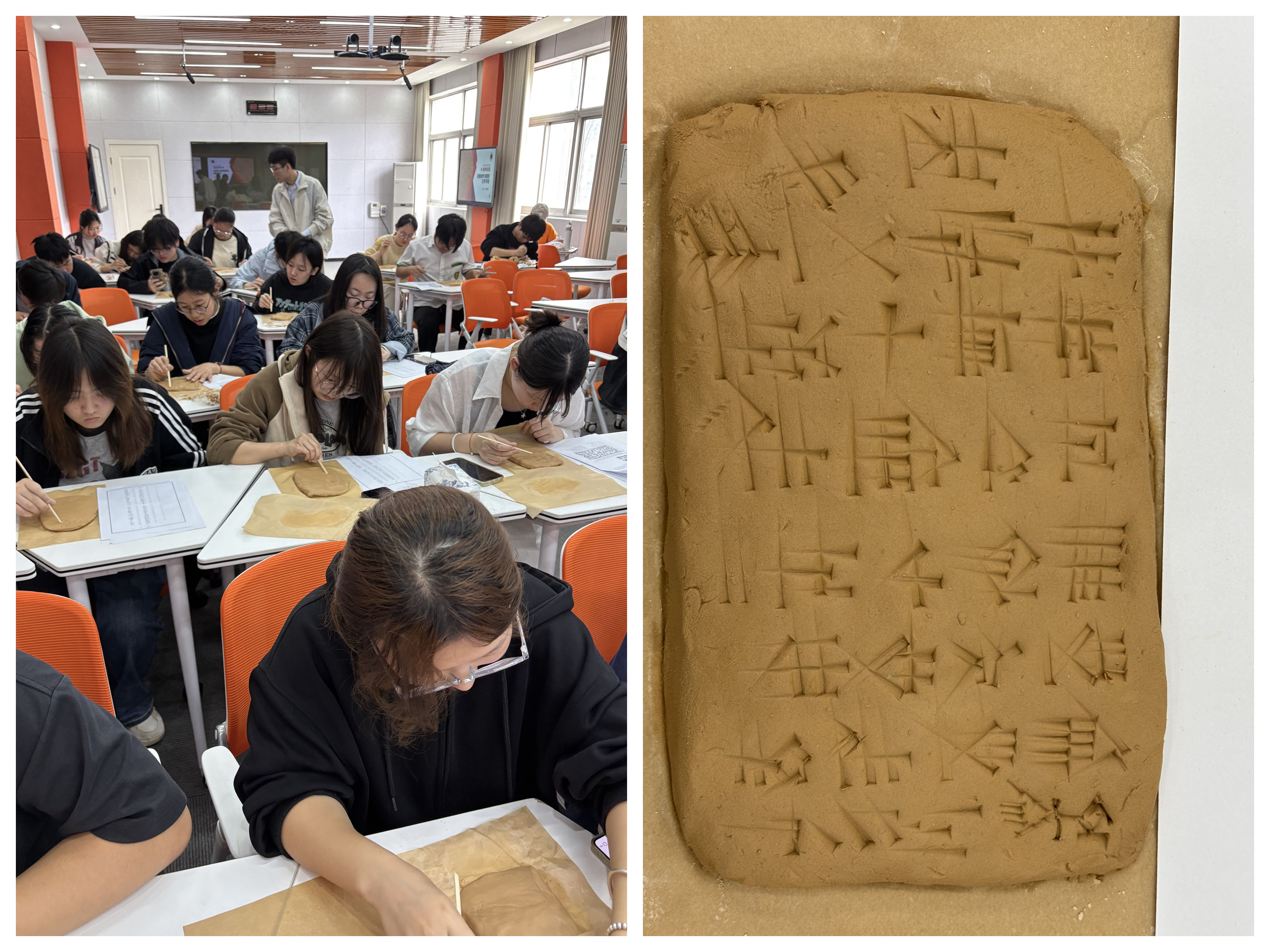 在动手实操环节,每位同学在现场领取了刻画材料包,包括陶泥泥板、楔形刻写笔、油纸等用具和来自经典原始文献的楔形文字示例。詹博士现场示范泥板制作流程和楔形文字刻画方法,并指导同学们亲手完成泥板制作、文字刻写等操作。同学们认真体验古代书写材料的质感与文字刻画的技巧,在实践中感受古代文明的独特魅力,进一步加深了对世界古代史相关知识的理解。现场气氛热烈,互动频繁,教学效果良好。