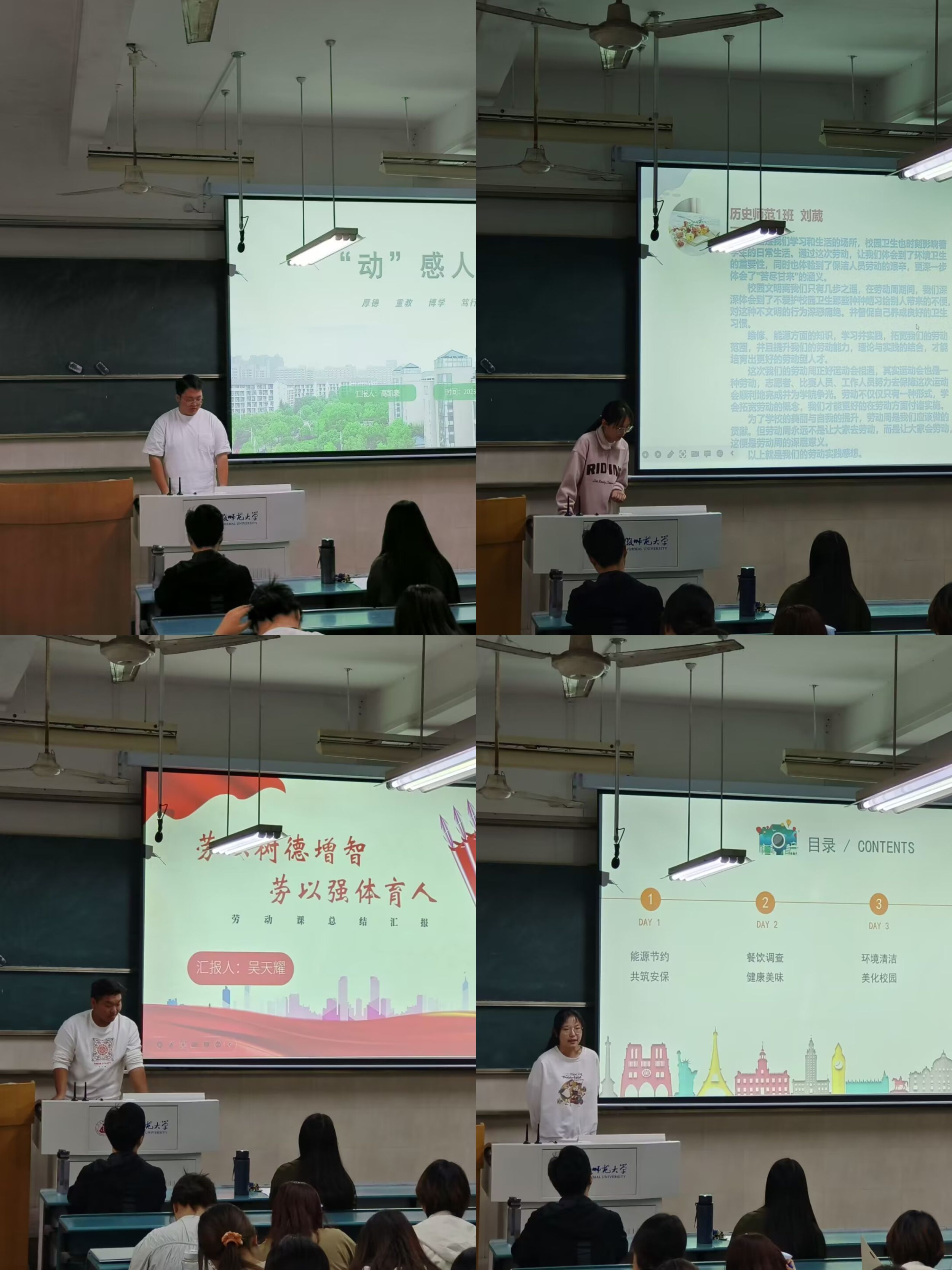 六位同学汇报完毕后,朱老师和詹老师分别进行总结发言,号召同学们积极投身于未来更广阔的劳动实践的天地中去。最后,詹老师宣布会议圆满结束。
