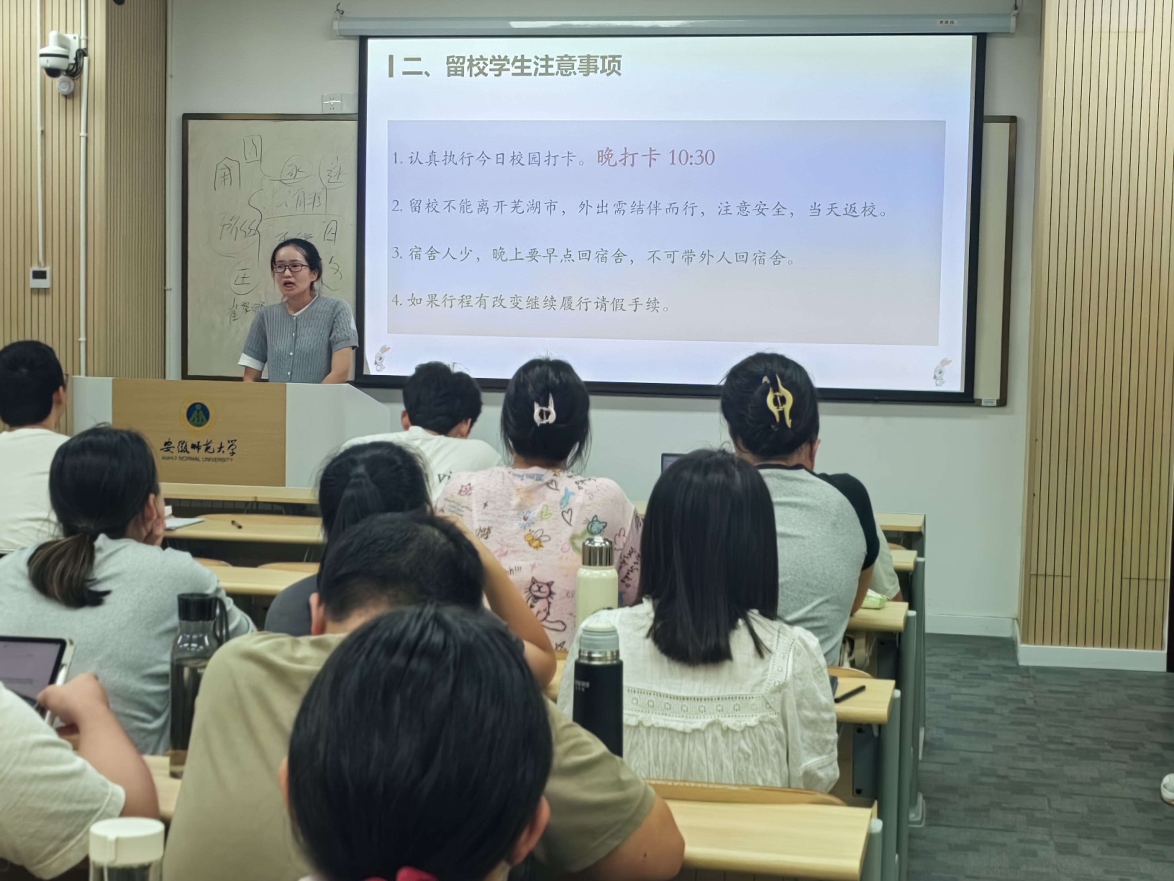 首先,胡文新再次强调了假期安排,说明调休的日程安排及课程调整,提醒同学们提前规划行程,避免因交通原因延误上课。其次,胡文新面向留校学生做出几点提醒,她重申了校园门禁制度,要求留校同学每晚打卡,严禁夜不归宿或留宿他人,如需外出建议结伴而行,若有行程变动及时履行请假手续。