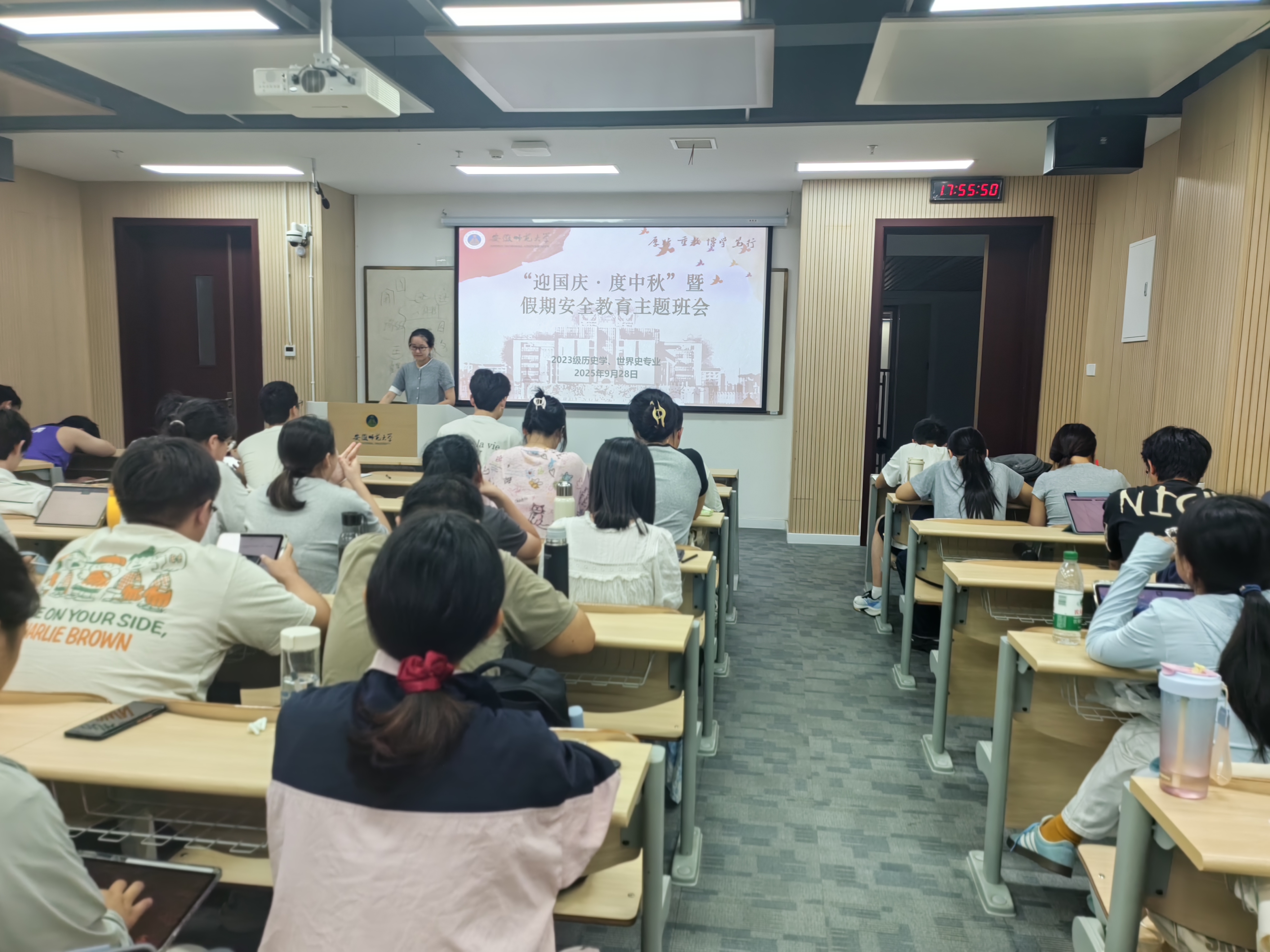 为增强同学们的安全防范意识,确保大家度过一个平安、祥和、愉快的“双节”长假,2023级历史学、世界史专业于9月28日分班级召开了“迎国庆·度中秋”假期安全教育主题班会,本次班会由辅导员胡文新主持,班级全体同学参加。