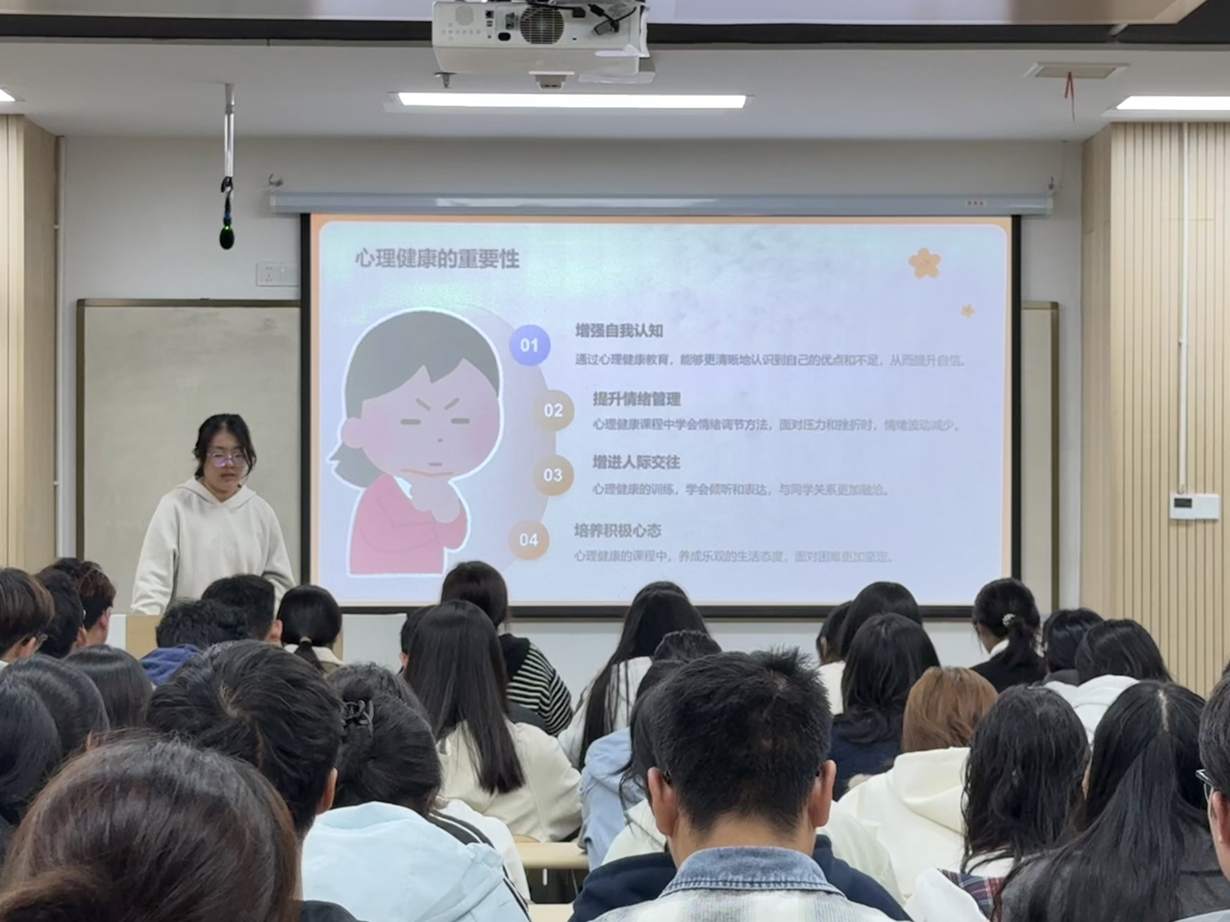 首先,主讲人通过定义解析,让同学们理解心理健康是一种"动态平衡"的最佳功能状态,而非追求完美无缺,让同学们对心理健康问题有了更加清晰的认识。其次,又从情绪稳定、情感丰富、社交能力、自我认知四个维度,结合具体案例阐述了健康心理的具体表现,引起了同学们的思考与共鸣。再次,心理委员对大学生群体中常见的焦虑、抑郁、人际关系等问题进行了梳理,并从个人经历、应激事件、环境适应和心理素质四个层面分析了问题产生的原因。最后,重点介绍了"四位一体"的维护策略,包括塑造积极心态、保持健康生活方式、学会情绪管理和主动寻求专业帮助,帮助同学们维护自己的心理健康,