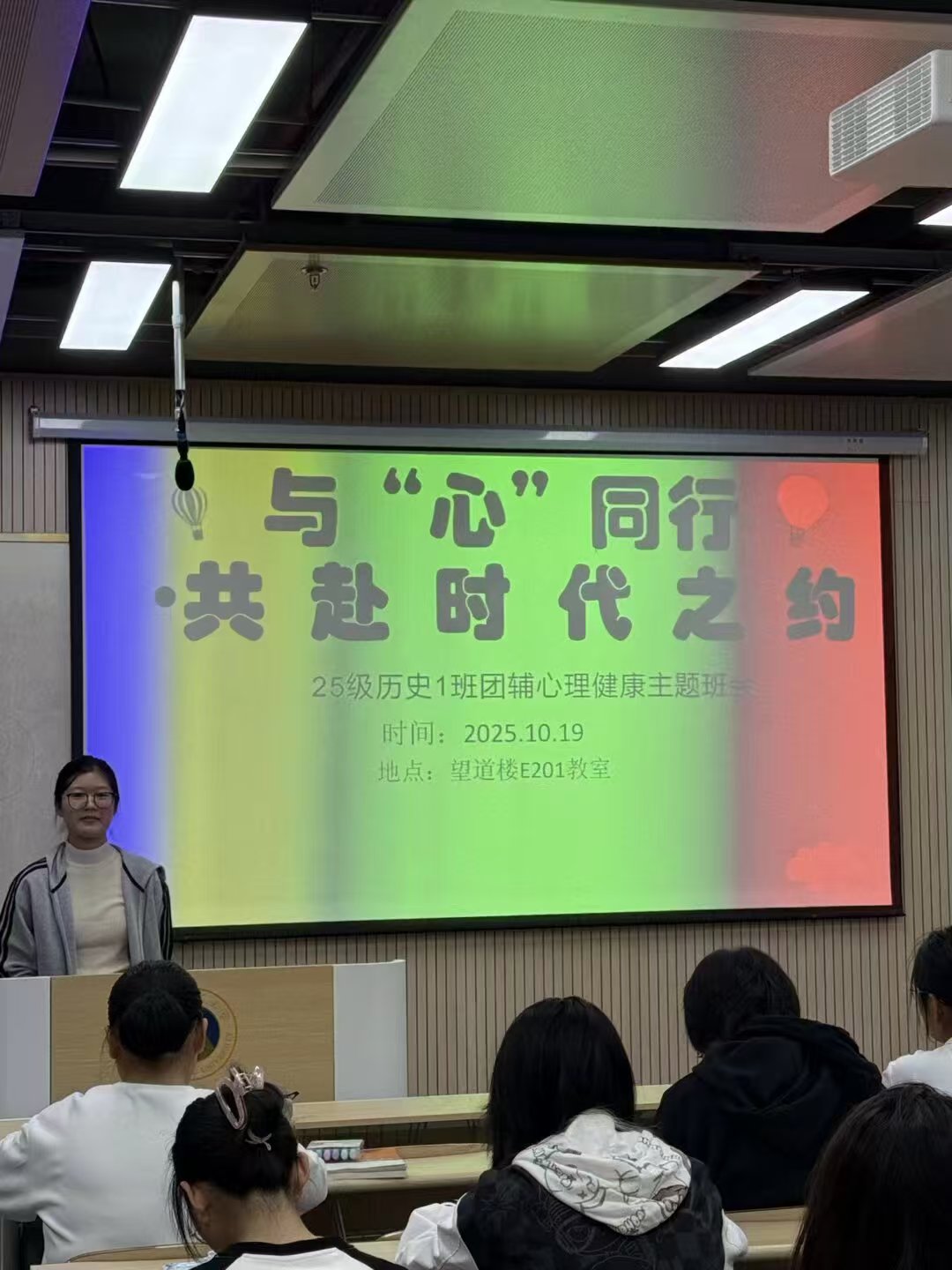 为积极响应学校“10·25”心理健康月的号召,普及心理健康知识,营造积极向上的班级氛围,2025年10月19日,25级历史1班在望道楼E201成功举办了“与‘心’同行,共赴成长之约”心理健康主题班会。