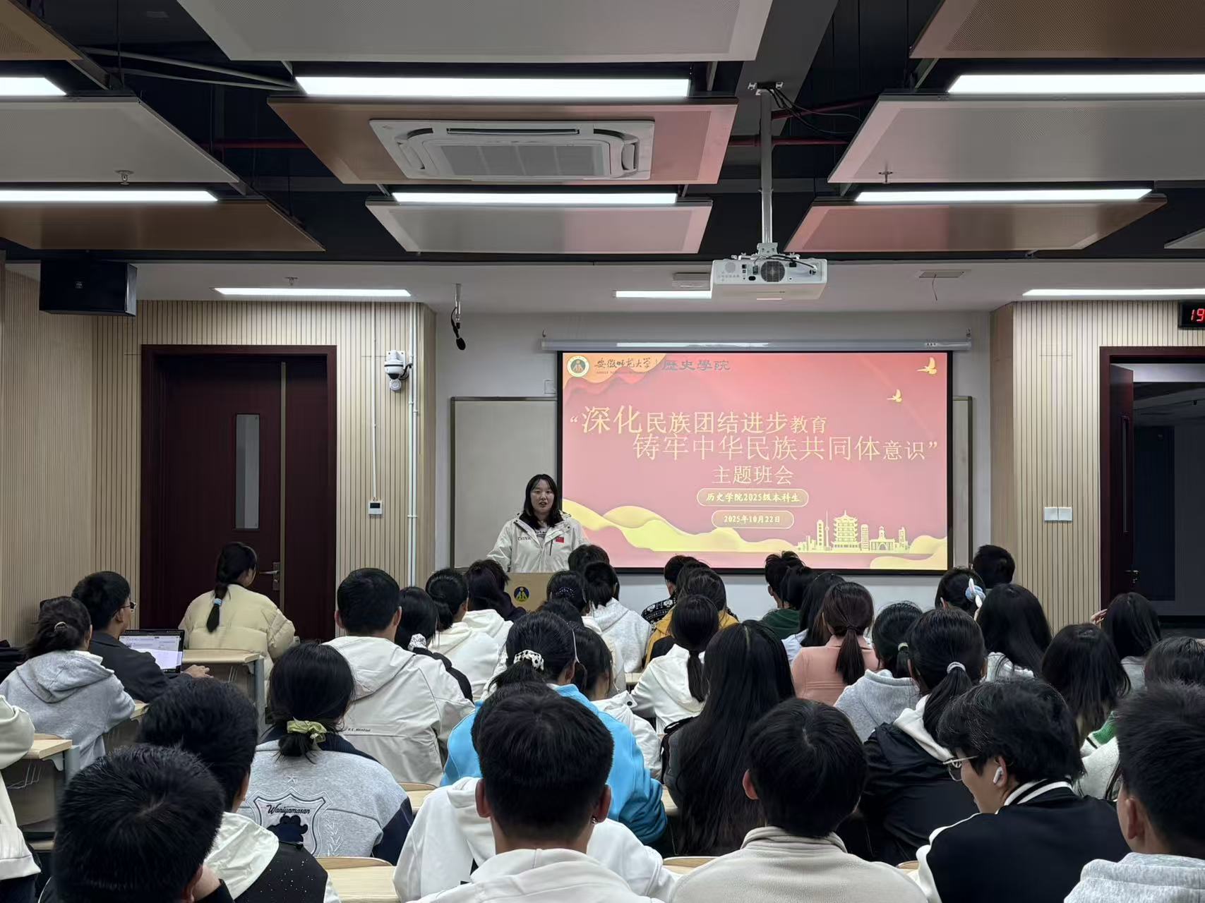 为引导青年学生牢固树立正确的国家观、历史观、民族观,2025级历史学专业于10月22日成功召开了“深化民族团结进步教育,铸牢中华民族共同体意识”主题班会。班会由辅导员韩雪老师主持,全体同学参与。