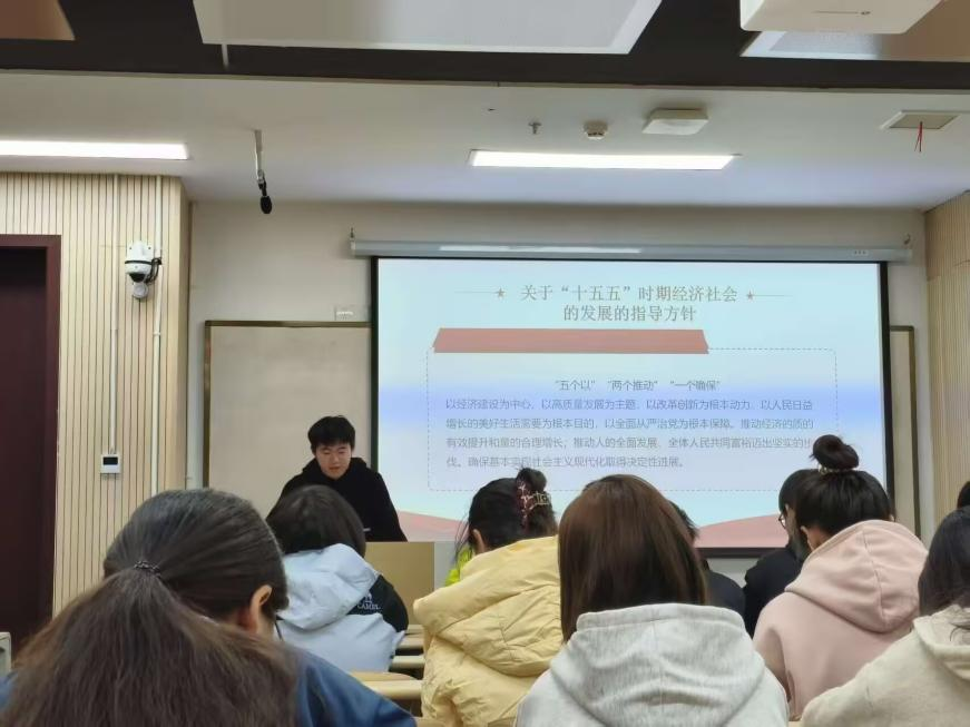 活动中,主讲人谌俊鸣同学从“全会看点速递”入手,详细介绍了二十届四中全会的背景、流程及其对青年发展的深远影响。他围绕“十五五”规划中的“五个以”“两个推动”“一个确保”等关键词,阐释了高质量发展、科技自立、国家安全、农业现代化等要点,结合和国内外局势分析“十五五”规划的重要性与关键点,并结合世界史专业特色,引导同学们从历史演进的角度理解国家治理现代化的必然性与紧迫性。最后,同学们就“新质生产力”“内需循环”“安全与发展”等议题展开了热烈讨论,同时认识到在逆风外部环境下增强个人能力、投身国家建设的重要性。