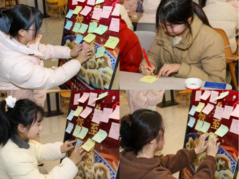 活动伊始,主持人冯凯详细介绍了本次活动的目的、流程及安全注意事项,并结合传统民俗知识,简要阐释了冬至的历史由来与各地特色习俗,让同学们在活动之初便深入感受传统节日的文化底蕴。准备工作就绪后,包饺子环节正式开启,同学们自发分组、分工协作,擀皮、包馅、捏形有条不紊。活动期间,历史学院研究生辅导员吕永鑫发表了热情洋溢的动员讲话,他寄语同学们在动手制作美食的过程中,既要增进同窗情谊,更要体悟中华优秀传统文化的温度与魅力。同学们充分发挥创意,包出了形态各异的精美饺子。包饺子环节结束后,每组挑选出最具创意的饺子参与评选,由食堂阿姨评选出“最佳创意小组”。活动尾声,热气腾腾的饺子端上餐桌,同学们围坐品尝亲手制作的美食,同时纷纷在便利贴上写下新年期许与真挚祝福。