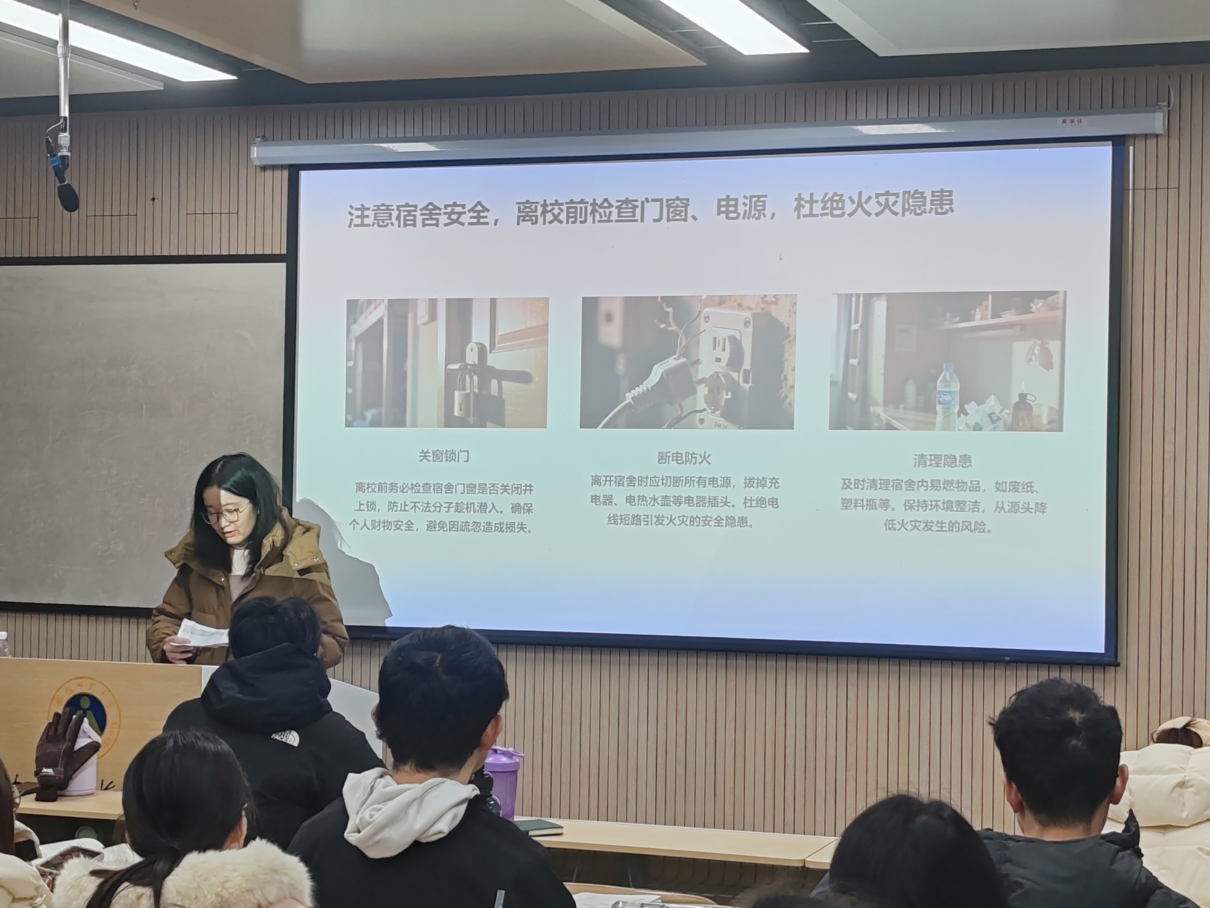 针对寒假离校安全,胡文新从交通出行、网络防诈、宿舍管理、健康生活四大维度逐项叮嘱。交通出行方面,提醒同学们选择正规运营交通工具,提前规划行程并向家人报备;网络安全方面,警示大家警惕电信诈骗,守护个人财产与信息安全;宿舍安全方面,要求离校前彻底清理宿舍垃圾,关闭水电阀门、锁好门窗,杜绝安全隐患。同时,鼓励同学们合理规划假期,保持健康作息,主动思考职业发展方向,让假期成为自我提升的契机。