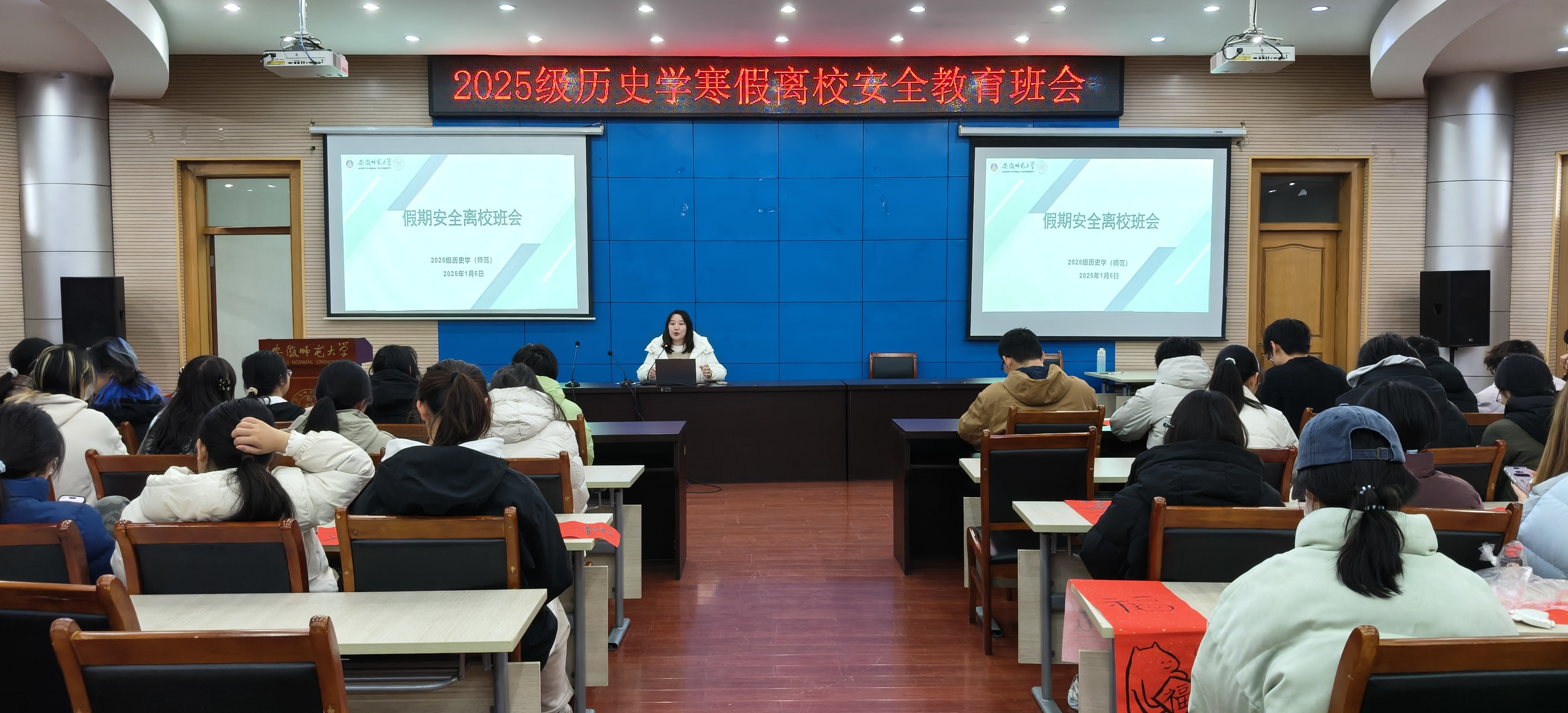 为切实筑牢寒假离校安全防线,强化全体同学的安全防范意识与自我保护能力,保障同学们度过一个平安、祥和、充实的新春佳节,2025级历史师范专业于2026年1月6日下午15:00在花津校区第三报告厅召开寒假离校安全教育专题班会。本次班会由辅导员韩雪老师主持,专业全体同学积极参与。