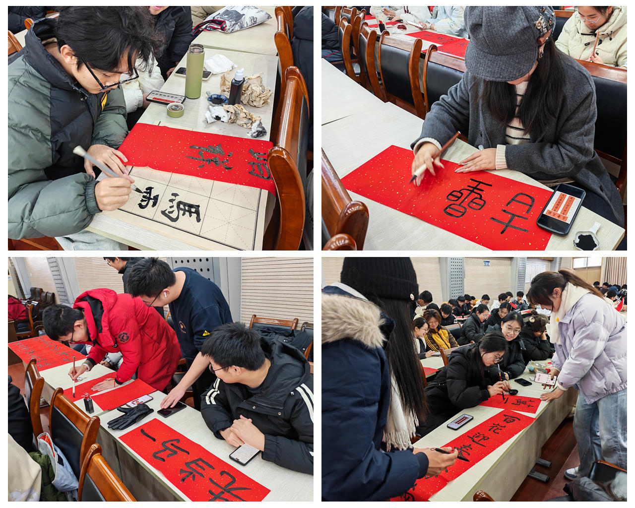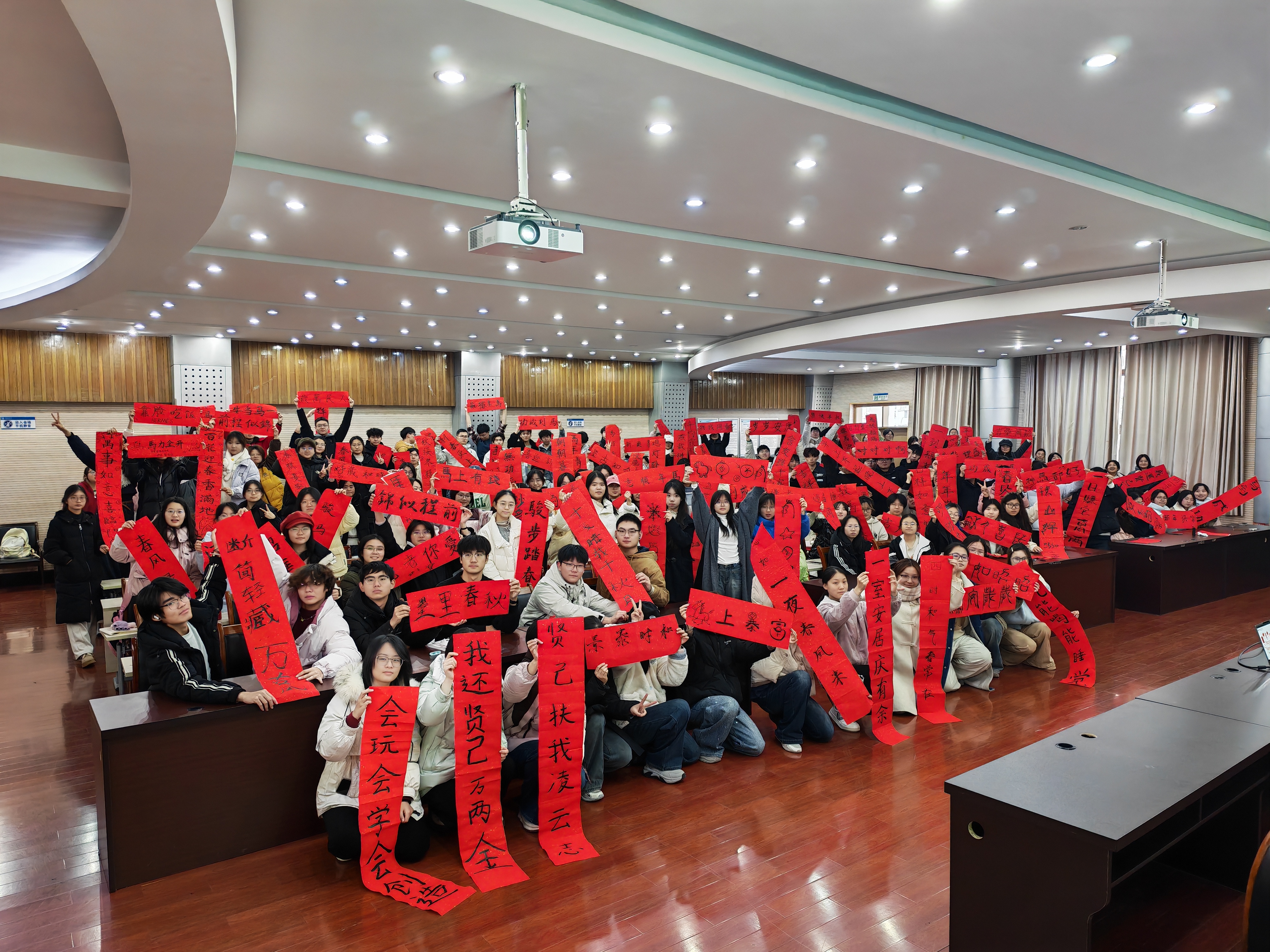 辅导员韩雪老师精心筹备,为同学们分发了红底对联纸等创作材料,组织开展新春原创对联书写活动。同学们热情高涨,踊跃参与,让喜庆的年味与青春的朝气跃然纸上。创作完成后,全体同学手持自己的得意之作,齐聚一堂合影留念,定格下这场别开生面的会前暖场时刻。