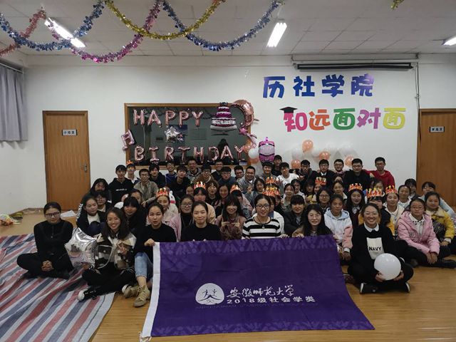 生日会分为四个部分:同学才艺展示、趣味小游戏、寿星吃蛋糕许愿、全员合影留恋。才艺表演环节,同学们展现了一个个精彩纷呈的节目,如吉他弹唱《平凡之路》、合作演唱古风歌曲《九张机》、为寿星室友深情演唱《房间》等;趣味小游戏可谓是最受同学们期待与欢迎的环节,开场游戏击鼓传花、真心话大冒险活跃了现场气氛,游戏猜人名不但提高了在场同学生日会参与度,同时了解到他人眼中的自己;活动接近尾声时,十七位寿星带上生日帽,在烛光与同学们的生日祝歌中许下了心愿;活动的最后环节,辅导员为大家演唱了《当你》,这首歌的最后一句“好喜欢你知不知道”既是歌词也是辅导员对全体18级社会学类同学的深情告白。生日会结束后,全体同学打扫卫生、整理场地,做到了“玩的时候热热闹闹,走的时候干干净净”。