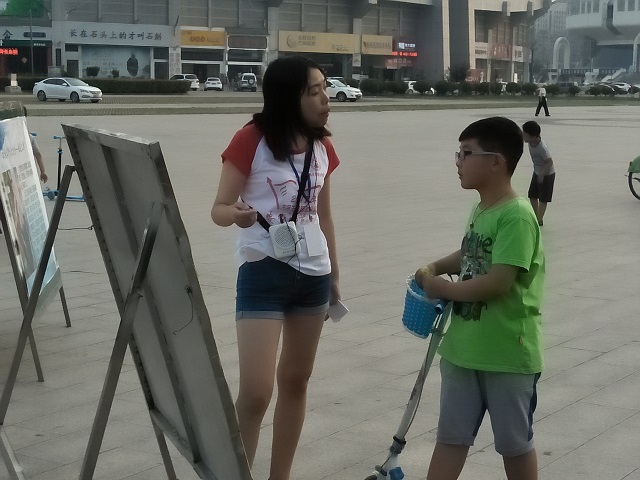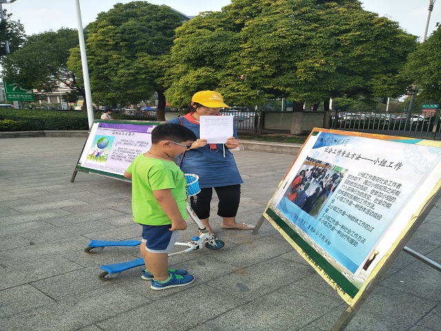 张贴有宣讲海报的展板果然是吸引大量路人注意的磁场。团队成员带着小蜜蜂音响站在展板前,为来往的路人介绍社会工作的由来,个案分析以及重要纪念日,还教过往的小朋友认字,宣讲是传播的途径,海报是宣讲的载体,团队利用精美的宣讲海报和团队的宣传优势,把社会工作的相关理念和内涵介绍给家乡的人,社工宣讲活动取得了圆满成功。
