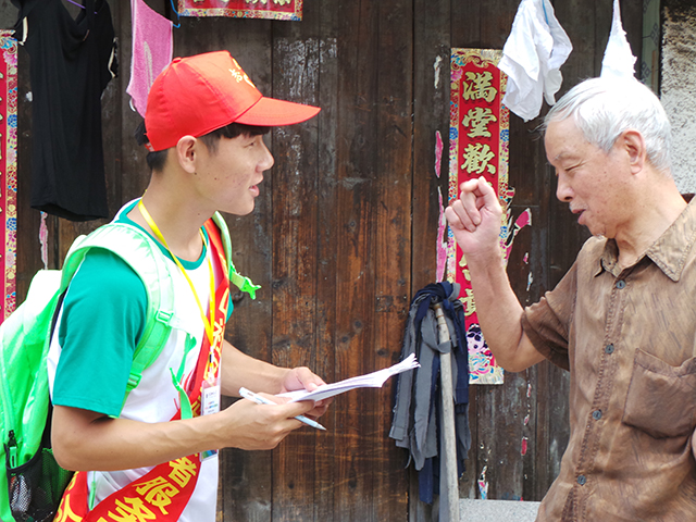 下午调研,分队一行12人分成3组,每组4人。三支锋矢,同时蓄发。公园里,队员们进行礼貌问访,陪休闲的老人一起漫步交谈,完成问卷调查;社区里,队员们进行入户访谈,陪巷口的老人拉拉家常,获取有用信息,记录访谈内容。
