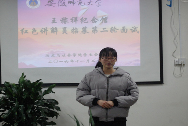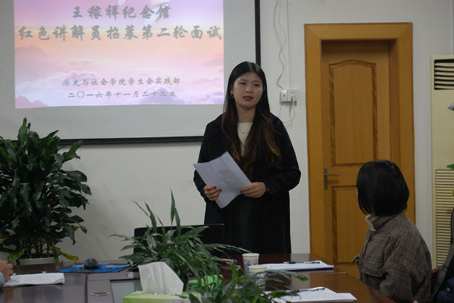 本网讯(院学生会 高金岩)为弘扬“奉献,友爱,互助,进步”的志愿者精神,推动青年志愿者活动的蓬勃开展,11月22日晚七时,我院于行政楼四楼会议室成功开展了以“文化讲解,志愿服务”为主题的王稼祥纪念馆红色讲解员招募活动。本次活动由16级辅导员、学生会指导老师周贤超,学生会主席吕永鑫,副主席郭忠尧,讲解员领队潘成红以及优秀讲解员韩露瑶担任评委,实践部部长刘金金主持。