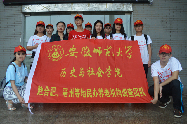 本网讯(历社学院 汪章靓 杨露露)为爱先行,共筑夕阳红,我们在路上。安徽师范大学历社学院赴芜湖、宣城、合肥等地进行安徽省民办养老机构社会公信力分析调查团队的社会实践于七月上旬圆满结束。两小队克服汛期暴雨,辗转三个城市,探访不同阶层,实地调研,收获良多。