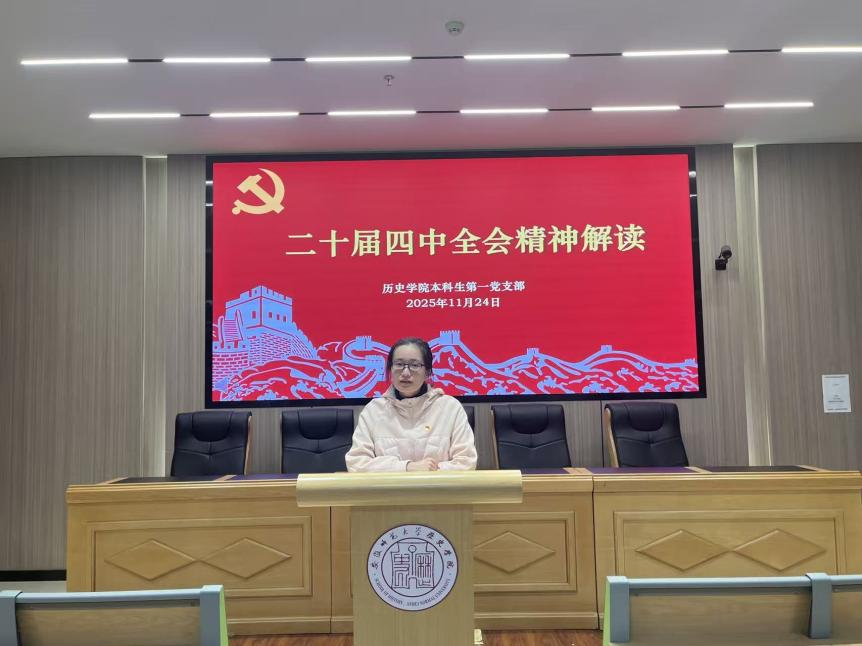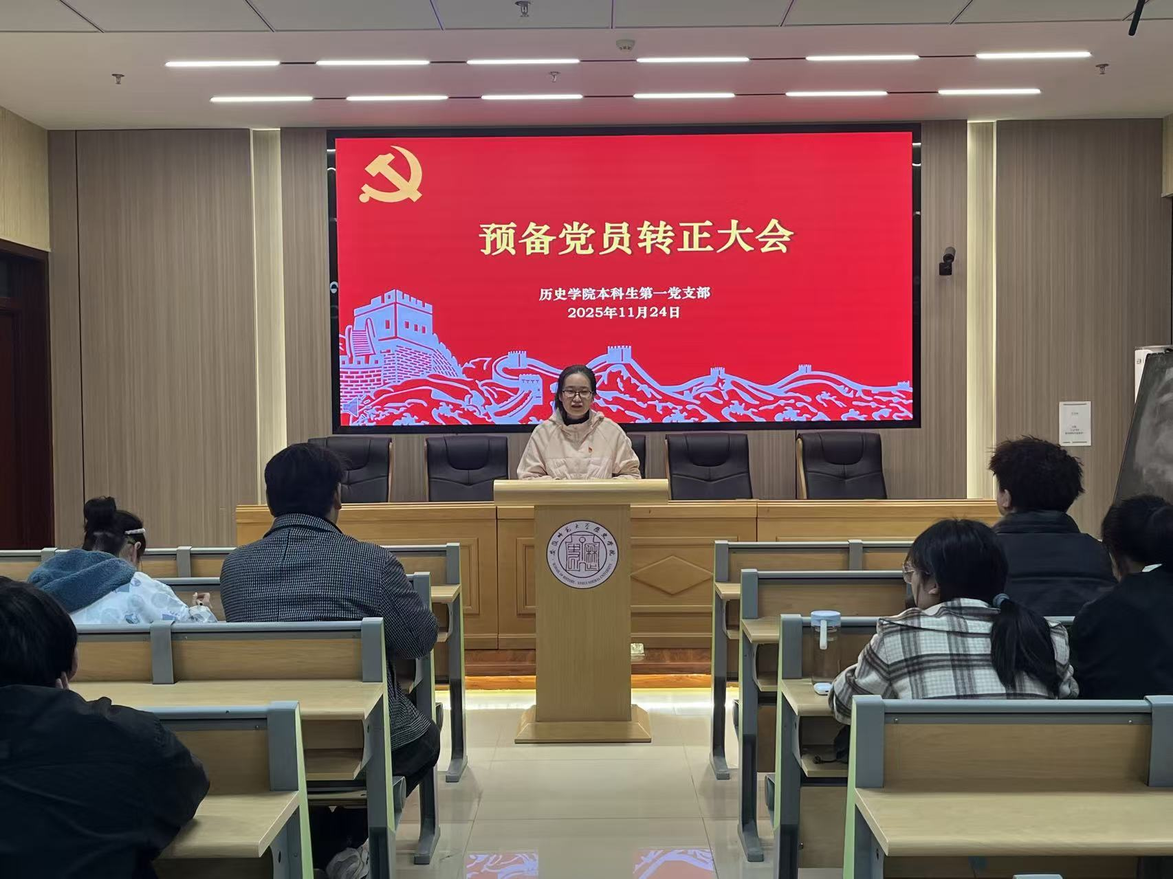 2025年11月24日晚,历史学院本科生第一党支部于文典楼B108召开了预备党员转正大会,讨论关于韩紫怡、马丽2名同志的预备党员转正问题。会议由支部副书记胡文新主持,支部书记宫超和支部全体党员到场参会。