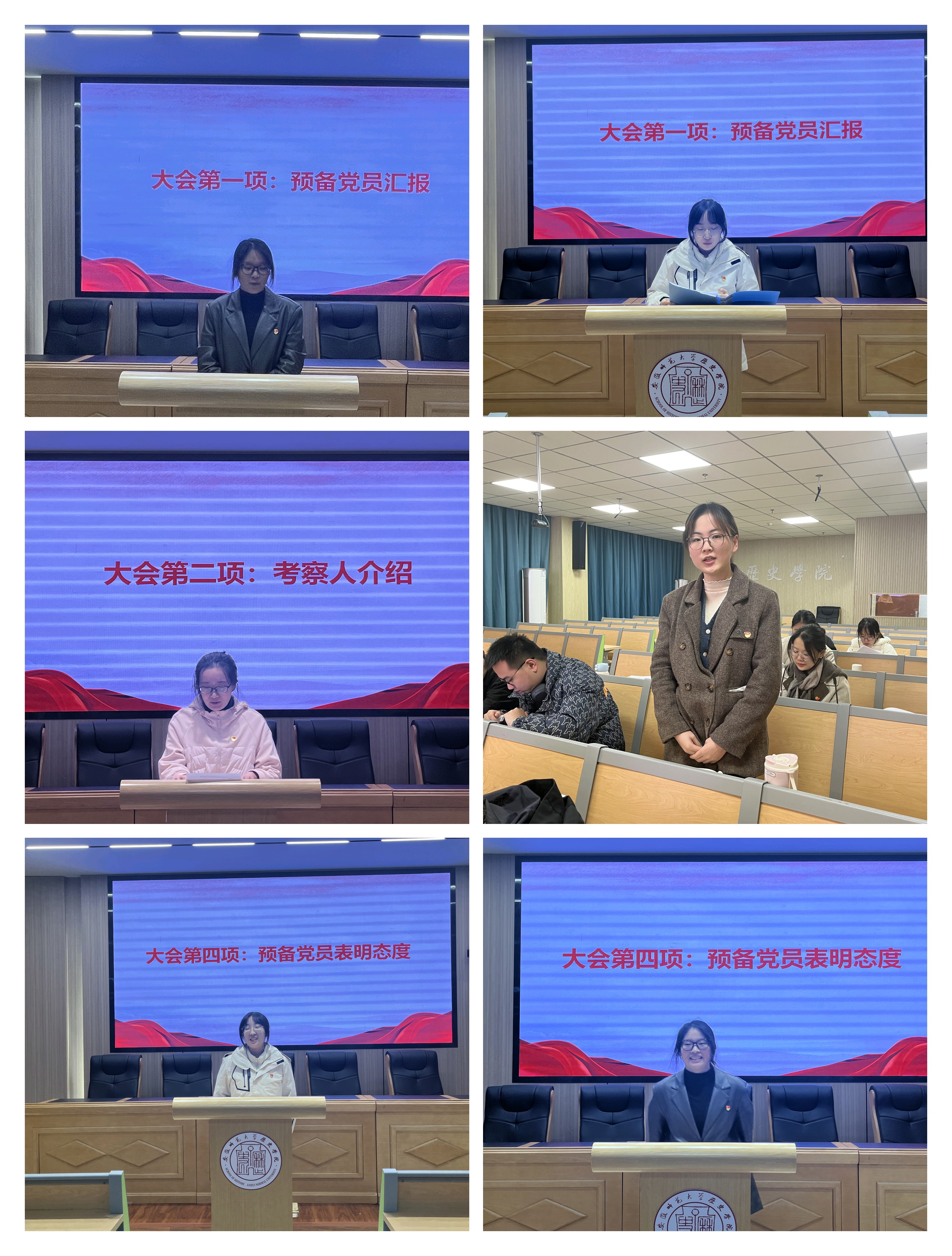 会议严格按照《中共安徽师范大学委员会发展党员工作实施细则》规定的相关程序进行。经预备党员汇报、考察人介绍、与会党员讨论、预备党员表明态度、投票表决和宣读表决决议,大会一致同意韩紫怡、马丽2位预备党员同志按期转正。